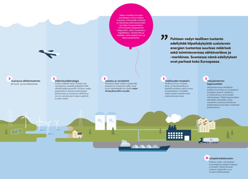 Vety kulkee useiden vaiheiden kautta raaka-aineesta lopputuotteeksi. Suomi tavoittelee Euroopan johtavaa asemaa vetytaloudessa. Tavoitteina ovat puhtaan vedyn ja sähköpolttoaineiden valmistus, teollisuuden uudistuminen, vientiliiketoiminnan kasvu sekä investointien varmistaminen Suomeen.
