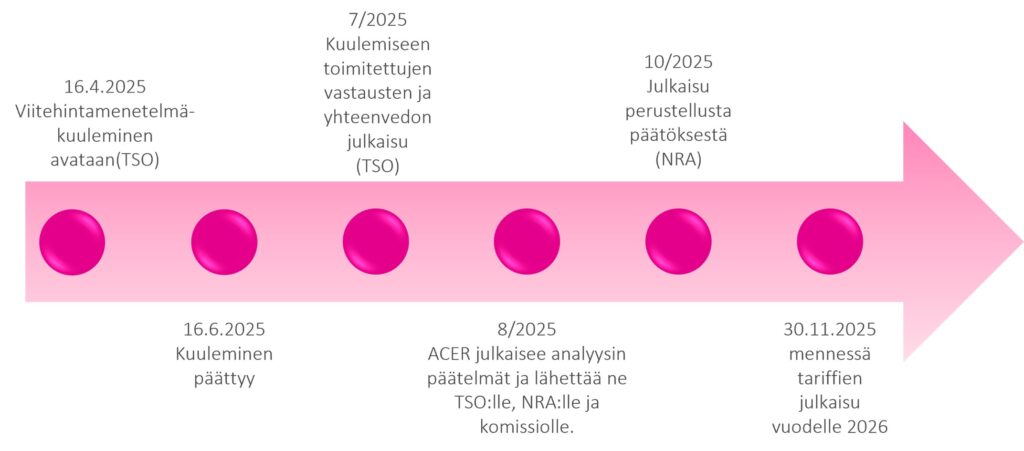 ACER analysoi kuulemisasiakirjan sisällön reflektoiden tariffiverkkosäännön artiklan 26 vaatimuksia, ja julkaisee analyysinsä viimeistään kaksi kuukautta kuulemisen päättymisen jälkeen. ACERin analyysi sekä vastaanotetut lausunnot huomioiden Energiavirasto tekee lopullisen, perustellun päätöksen Suomessa sovellettavasta viitehintamenetelmästä lokakuun 2025 alkuun mennessä.