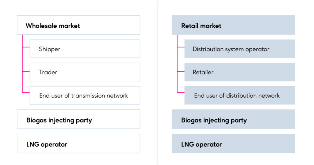 The wholesale market participants comprise the shippers, traders and transmission network end users. The retail market participants comprise retailers, retailers with delivery obligation and distribution network end users. Biogas injecting parties and LNG processing facility operators may operate in the wholesale or retail market depending on whether the facility is connected to the transmission or distribution network.