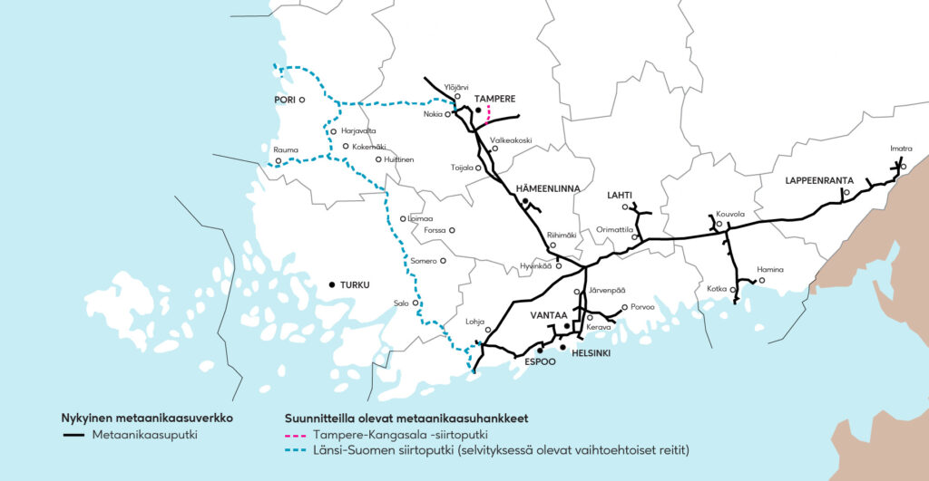Gasgrid selvittää kansallisen maakaasun siirtoverkon laajentamista Länsi-Suomeen. Suunnitteilla oleva uusi putkilinja kulkisi joko Tampereen kautta Pori–Rauma-suunnalle tai vaihtoehtoisesti Inkoosta Pori–Rauma-suunnalle. Reitti tarkentuu, kun alueen kaasun käyttäjien tarpeet on kartoitettu.